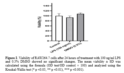 Treatment of RAW264.7 cells with 0.3% DMSO, equivalent to the highest concentration used as a solvent for 5-HIAA, and with 100 ng/ml LPS for 24 hours did not result in any significant cytotoxic effects (P-value =0.124, P-value =0.466, respectively) (Figure 2).