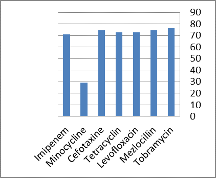 Overall, 55% of the isolates were identified as A. baumanni. The frequency of A. baumanni isolates was highest in men (76.4%) and patients aged 50 years and older (60%). The rate of antibiotic resistance among A. baumanni was highest against tobramycin (76.3%) and lowest against minocycline (29.1%) (Figure 1).