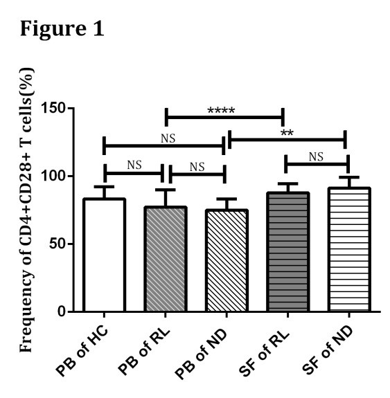 The frequency of CD4+CD28+ T cells expressing PD-1 in PB of ND and RL patients was significantly higher than the healthy subjects (p<0.0001 and p=0.039) (Fig 3). Similarly, a higher percentage of CD4+CD28- T cells expressing PD-1 was observed in PB of both ND and RL patients as compared with healthy control (p<0.0001 and p=0.011) (Fig 4). Analysis demonstrated a significant increase in PD-1 expression on CD4+CD28+ and CD4+CD28- T cells in SF versus PB of RL patients (p<0.0001 and p<0.0001) (Fig 3,4).