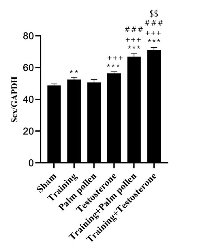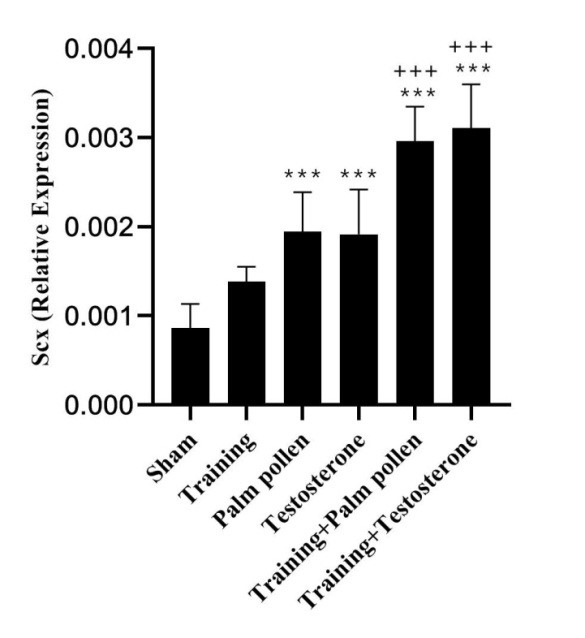 The results of Tukey’s post- hoc test showed that Scx gene expression levels in palm pollen, testosterone, training + palm pollen and training + testosterone groups were significantly higher than sham group (P=0.001) also in training + palm pollen and training + testosterone groups were significantly higher than training, palm pollen and testosterone groups (P=0.001) (Figure 1).