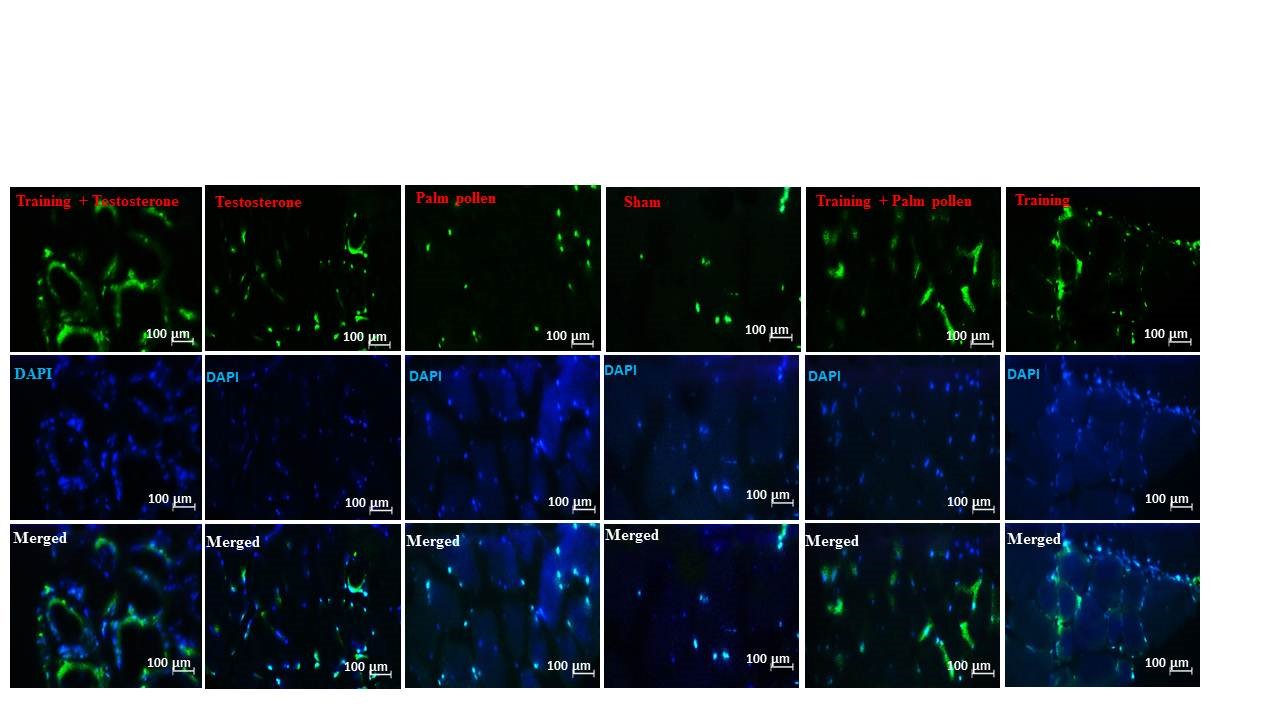 In this experimental study, 30 male adult rats were purchased and transferred to animal laboratory. The rats were kept under standard conditions (humidity of 45 to 55%, dark-light cycle of 12-12 hours and temperature of 23 ± 2 ° C) for one week to adapt to the new environment with free access to food and water. In all periods of research all rats consumed standard food pellets including crude protein 23%, crude fat 3.5%- 4.5%, crude fiber 4%- 4.5%, ash maximum 10%, calcium 0.95%- 1%, phosphorus 0.65%- 0.75%, salt 5%- 5.5%, humidity maximum 10%, lysine 1.15%, methionine 0.33%, methionine + cysteine 0.63%, threonine 0.72%, and tryptophan 0.25%. Then all rats divided into 6 groups of 6 rats including: 1) sham, 2) training, 3) palm pollen, 4) testosterone, 5) training + palm pollen, and 6) training + testosterone. During 4 weeks, groups 2, 5, and 6 performed resistance trainings for five sessions per week (11); groups 3 and 5 received 100 mg/kg palm pollen for five days per week via gavage (12) and groups 4 and 6 received 2 mg/kg testosterone propionate peritoneally (13). Forty- eight hours after the last training session as well as palm pollen and testosterone administration, the rats after 12 hours fasting were anesthetized with ketamine (50mg/kg) (Sigma-Aldrich Company) and xylazine (10mg/kg) (Sigma-Aldrich Company), and after extracting tendon tissue and transferring it to laboratory; the Scx protein and gene expression levels were measured using Western blot and real-time PCR methods respectively. It should be noted that researchers received introduction letters from Marvdasht Branch of Islamic Azad University.