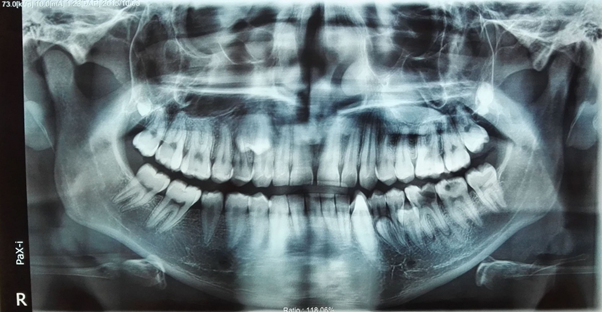Fig1. The panoramic radiograph showed the presence of ten supernumerary teeth in all four quadrants