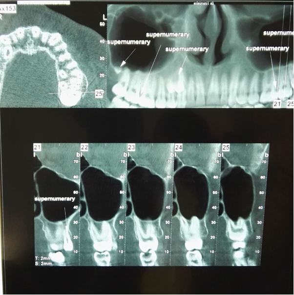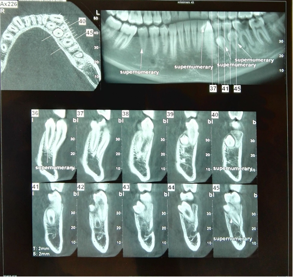 Supernumerary teeth could be defined as the teeth in excess of the normal dentition (1). Such an overplus can also be accompanied by a loss of other teeth. For instance, 32 permanent teeth may be present with five mandibular incisors and only three mandibular premolars. It can be single or multiple, unilateral or bilateral, morphologically malformed or normal in shape and size, and erupted or impacted (2-4). Cases that involving one or two supernumerary teeth most commonly involve the anterior region of upper jaw, and after that the lower jaw premolar area (5). While multiple supernumerary teeth are present (>5), the most common place that affected could be the region of bicuspid teeth (6). Single supernumeraries occur in 76 to 86 percent of cases. Double supernumeraries occur in 12 to 23 percent of cases, and multiple supernumeraries in less than one percent (7-9).