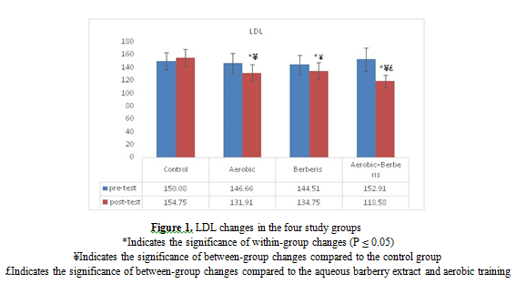 The results of this study also showed that consumption of aqueous extract of barberry for 8 weeks significantly decreased total cholesterol and triglyceride levels and significantly increased HDL compared to the control group. LDL levels, despite significant decrease in the barberry juice group, were not significantly different compared to the control group. Past studies have shown that some natural antioxidants such as berberine and natural phenols (such as lycopene and vitamin E) reduce blood lipids