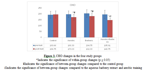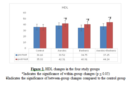 (20). Therefore, the aim of this study was to investigate the effect of aqueous extract of barberry and aerobic training on insulin resistance and blood lipid levels in men with type 2 diabetes. The results of this study showed that after8 weeks of aerobic training and consumption of aqueous extract of barberry at a dose of 200cc daily, insulin levels and levels of insulin resistance, glucose and blood lipid index significantly decreased in men with type2 diabetes compared to the control group.Recently, Lazaviet al. (2018) have shown that consuming 200ml of barberry juice daily for 8weeks significantly reduced fasting blood sugar in the barberry juice extract group