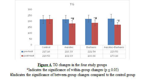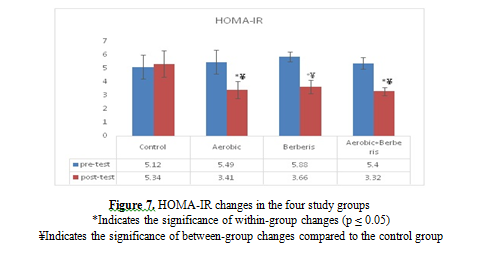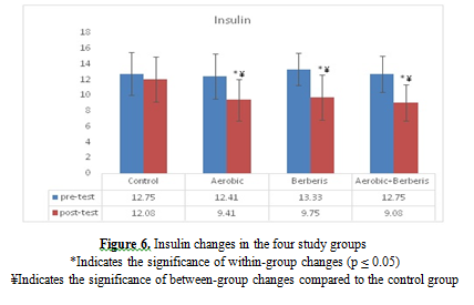 (28). Therefore, the reasons for the decrease in insulin levels in the training as well as training with aqueous extract of barberry consumption groups in the pre- and post-protocol stages, as well as the comparison of the insulin levels of these groups with the control group, can be attributed to the important role of barberry extract and the decreasing effect of aerobic training.