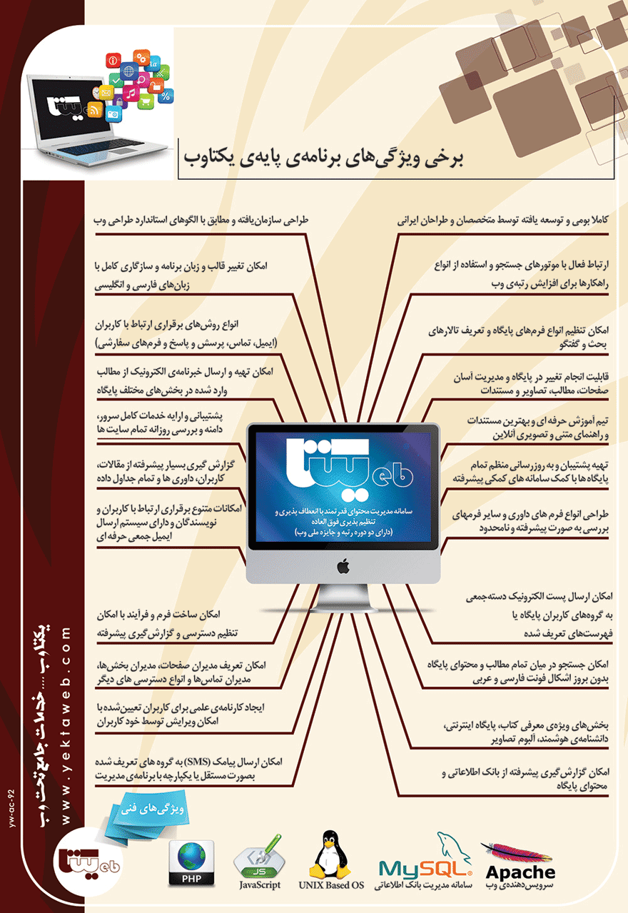 bullet پایگاه‌های اینترنتی سازمان‌های بزرگ، خود از مجموعه ای از پایگاه‌های فرعی تشکیل شده‌اند. مدیریت یکپارچه اطلاعات عرضه شده در پایگاه‌های فرعی یکی از دغدغه‌های اصلی مدیران اینگونه پایگاه‌هاست که با استفاده از نرم‌افزارهایی که ویژه این امر طراحی شده‌اند می‌توان راه حل مناسبی برای آن ارایه داد. در طراحی مجموعه یکتاوب سعی بر آن بوده است راهکار جامع و کارآمدی برای مدیریت یکپارچه اطلاعات پایگاه‌های سازمانی بزرگ فراهم شود.