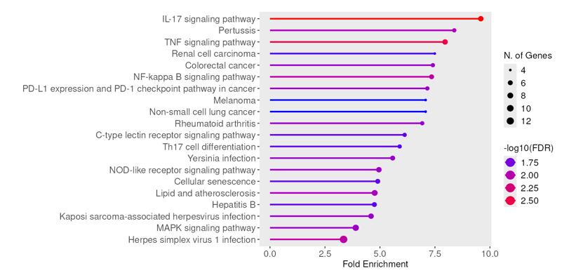 We conducted gene enrichment analysis on the 414 significant genes identified during feature selection. Gene enrichment analysis is illustrated in Figure 1. The majority of the identified genes are associated with inflammatory and immune responses, including the IL-17, NF-κB, and TNF signaling pathways. According to the KEGG database results, these biological pathways are presented in Figures 2A - C.