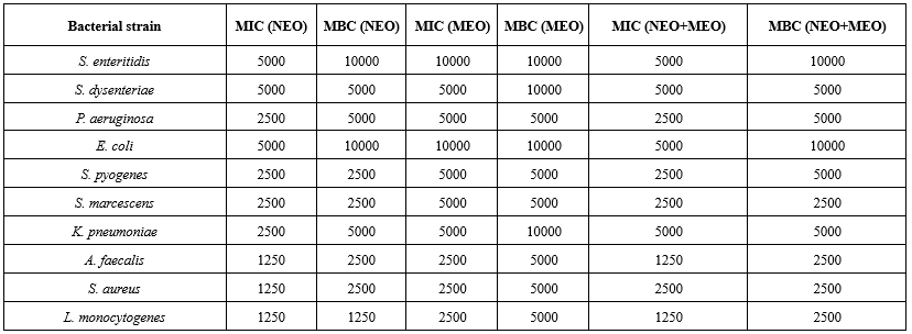 Table 1. Antibacterial activity of nettle essential oil (NEO), mallow essential oil (MEO), and their 1:1 combination based on MIC and MBC values