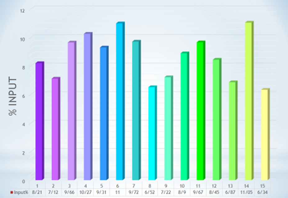 Where AE is the duplication efficiency, and Fd is the dilution compensation factor to the balance differential input of the DNA quantities and ChIP obtained for the qPCR (value estimated at 0.1 based on the ChIP process). The input percentage of the study samples (presence level of H3K4me3) is depictedin Figures 1-3.