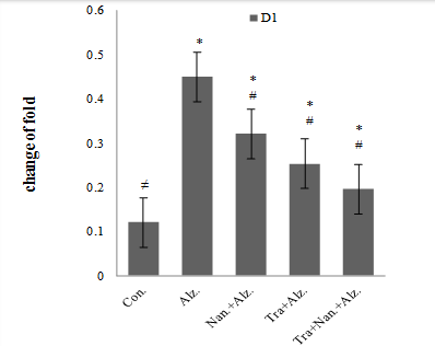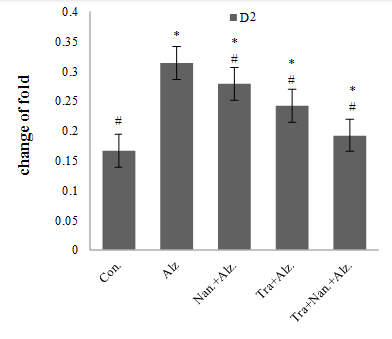 Descriptive information was reviewed and recorded. A comparison of D1 and D2 receptor gene expression showed the most significant increase in the Alzheimer's group. Increased expression of the D1 and D2 receptor gene was lower in Alzheimer's + HIIT + folate Nano-liposome group than in the Nano-liposome folate, Alzheimer's, and HIIT groups (Figure 1 and 2) (P<0.001)