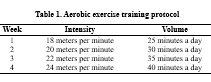The exercise training protocol included 4-week moderate-intensity aerobic exercises with a frequency of 3 sessions per week. In the first week, the experimental group ran on the treadmill at a speed of 18 meters per minute for 25 minutes in each session. Then, every week, the volume of training (training time in each session) and training intensity (running speed) increased progressively until the fourth week (19). The details of the training protocol are provided in Table 1.