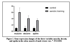 The results obtained from the independent t-test showed that the gene expression of all three variables, muslin (P=0.0001), decorin (P=0.0001), and apelin (P=0.0001) in the aerobic training group was significantly higher than in the control group.